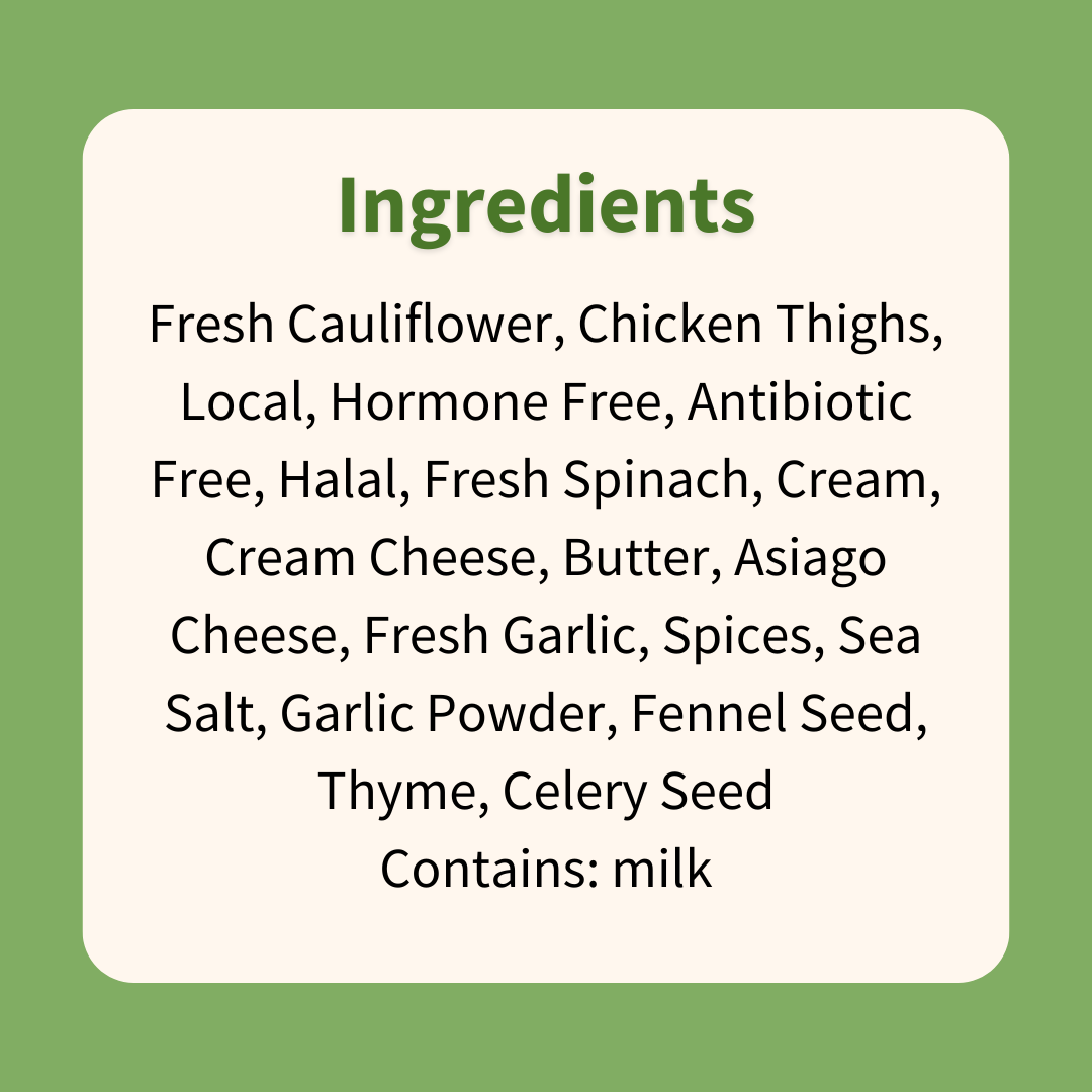 Fresh Cauliflower, Chicken Thighs, Local, Hormone Free, Antibiotic Free, Halal, Fresh Spinach, Cream, Cream Cheese, Butter, Asiago Cheese, Fresh Garlic, Spices, Sea Salt, Garlic Powder, Fennel Seed, Thyme, Celery Seed Contains: milk