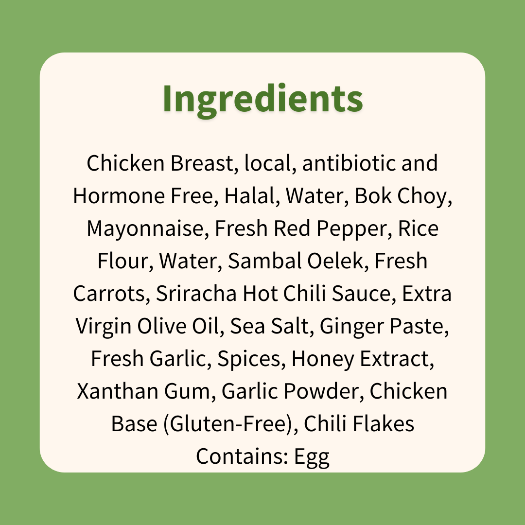 Chicken Breast, local, antibiotic and Hormone Free, Halal, Water, Bok Choy, Mayonnaise, Fresh Red Pepper, Rice Flour, Water, Sambal Oelek, Fresh Carrots, Sriracha Hot Chili Sauce, Extra Virgin Olive Oil, Sea Salt, Ginger Paste, Fresh Garlic, Spices, Honey Extract, Xanthan Gum, Garlic Powder, Chicken Base (Gluten-Free), Chili Flakes Contains: Egg