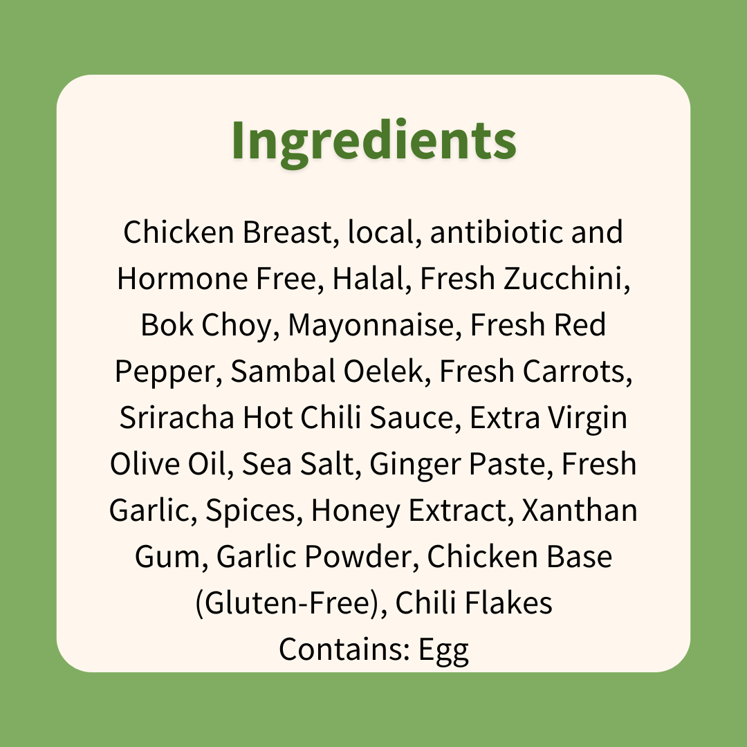 Chicken Breast, local, antibiotic and Hormone Free, Halal, Fresh Zucchini, Bok Choy, Mayonnaise, Fresh Red Pepper, Sambal Oelek, Fresh Carrots, Sriracha Hot Chili Sauce, Extra Virgin Olive Oil, Sea Salt, Ginger Paste, Fresh Garlic, Spices, Honey Extract, Xanthan Gum, Garlic Powder, Chicken Base (Gluten-Free), Chili Flakes Contains: Egg