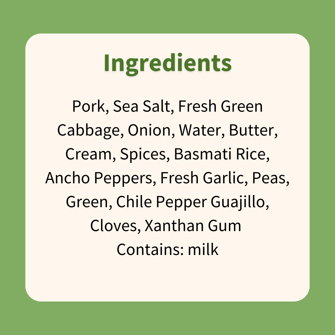 Pork, Sea Salt, Fresh Green Cabbage, Onion, Water, Butter, Cream, Spices, Basmati Rice, Ancho Peppers, Fresh Garlic, Peas, Green, Chile Pepper Guajillo, Cloves, Xanthan Gum Contains: milk