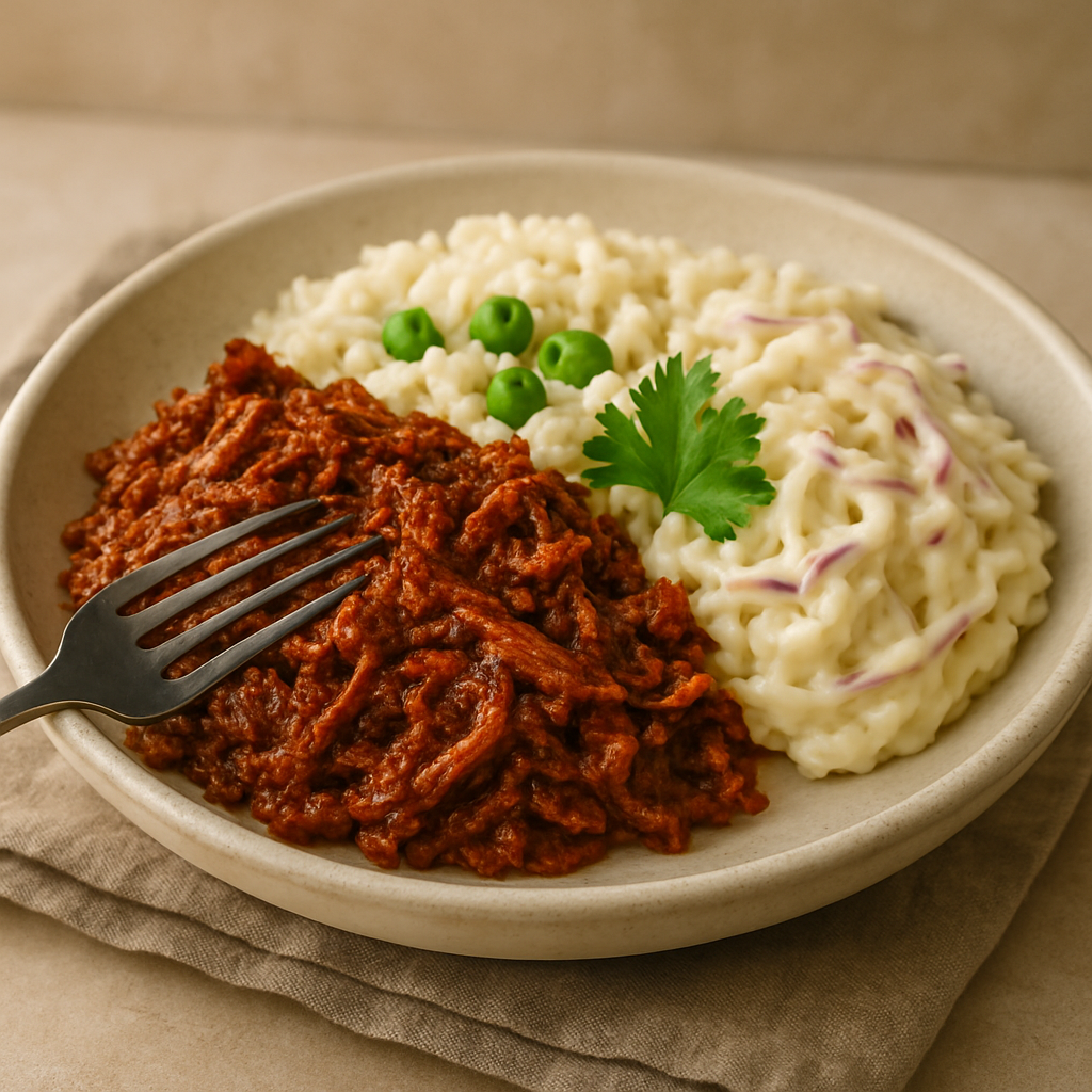 Pork Barbacoa with Rice & Peas & Creamy Cabbage