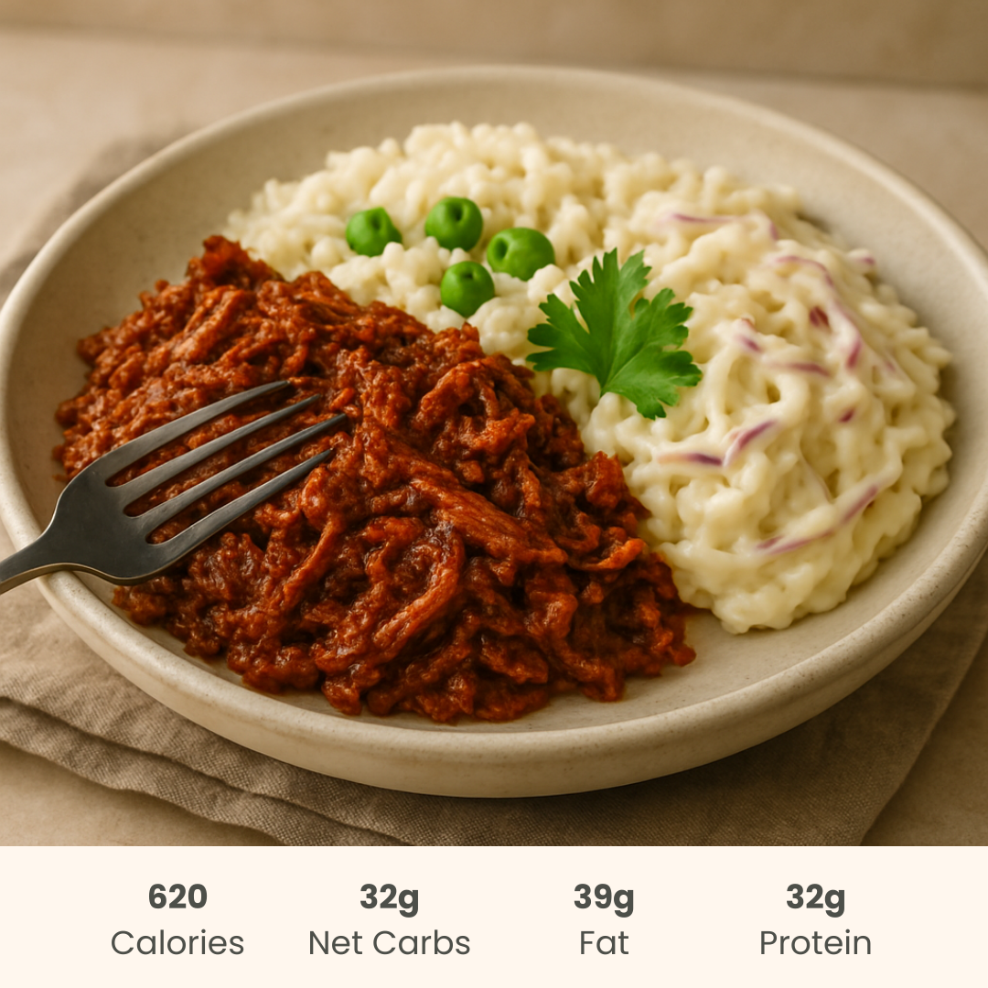 Get ready for a flavour-packed plate that’s going to hit all the right spots. Our Barbacoa Pork is tender, juicy, and full of smoky goodness, paired with perfectly cooked basmati rice and peas for that comforting, homey vibe. And don’t even get us started on the creamy cabbage—it’s rich, creamy and ties everything together in the most satisfying way. With 30 grams of protein and under 500 calories, this meal is not just delicious but also calorie smart and high in protein. Fuel up with a dish that keeps you feeling full, energized, and ready for whatever’s next!