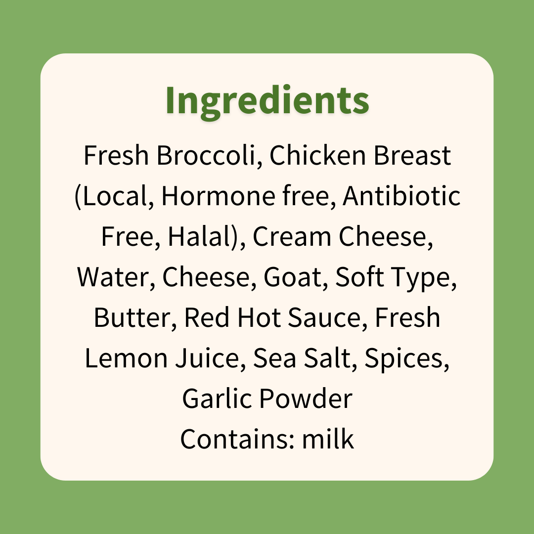 Fresh Broccoli, Chicken Breast (Local, Hormone free, Antibiotic Free, Halal), Cream Cheese, Water, Cheese, Goat, Soft Type, Butter, Red Hot Sauce, Fresh Lemon Juice, Sea Salt, Spices, Garlic Powder Contains: milk