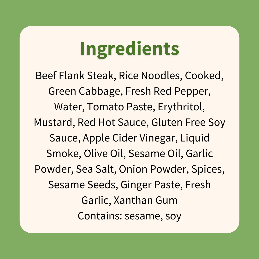 Beef Flank Steak, Rice Noodles, Cooked, Green Cabbage, Fresh Red Pepper, Water, Tomato Paste, Erythritol, Mustard, Red Hot Sauce, Gluten Free Soy Sauce, Apple Cider Vinegar, Liquid Smoke, Olive Oil, Sesame Oil, Garlic Powder, Sea Salt, Onion Powder, Spices, Sesame Seeds, Ginger Paste, Fresh Garlic, Xanthan Gum Contains: sesame, soy