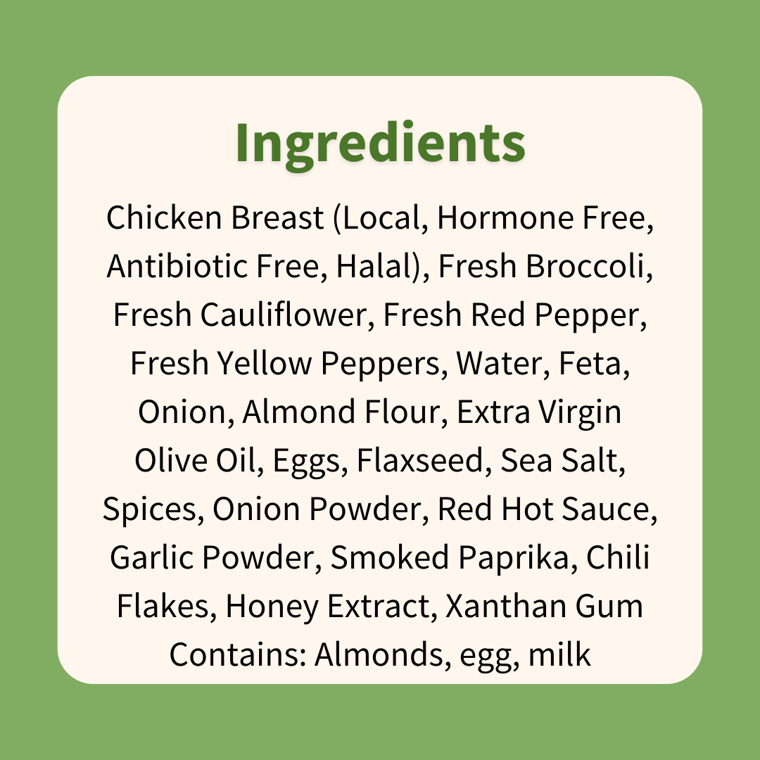 Chicken breast, fresh broccoli, fresh cauliflower, fresh red and yellow peppers, water, feta, onion, almond flour, extra virgin olive oil, eggs, flaxseed, sea salt, spices, onion powder, red hot sauce, garlic powder, smoked paprika, chili flakes, honey extract, xanthan gum. Contains almonds, egg, milk.
