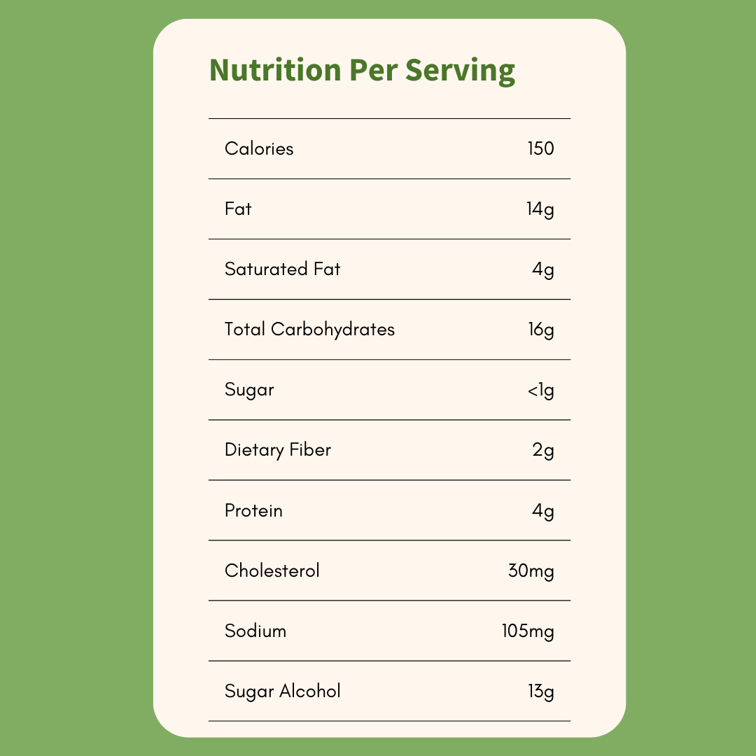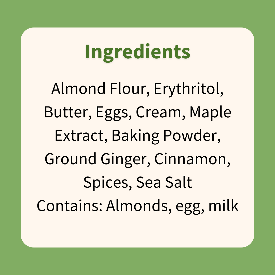 Almond Flour, Erythritol, Butter, Eggs, Cream, Maple Extract, Baking Powder, Ground Ginger, Cinnamon, Spices, Sea Salt Contains: Almonds, egg, milk