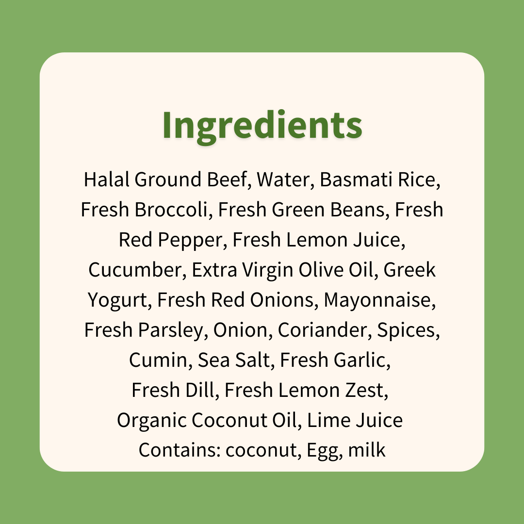 Halal Ground Beef, Water, Basmati Rice, Fresh Broccoli, Fresh Green Beans, Fresh Red Pepper, Fresh Lemon Juice, Cucumber, Extra Virgin Olive Oil, Greek Yogurt, Fresh Red Onions, Mayonnaise, Fresh Parsley, Onion, Coriander, Spices, Cumin, Sea Salt, Fresh Garlic, Fresh Dill, Fresh Lemon Zest, Organic Coconut Oil, Lime Juice Contains: coconut, Egg, milk