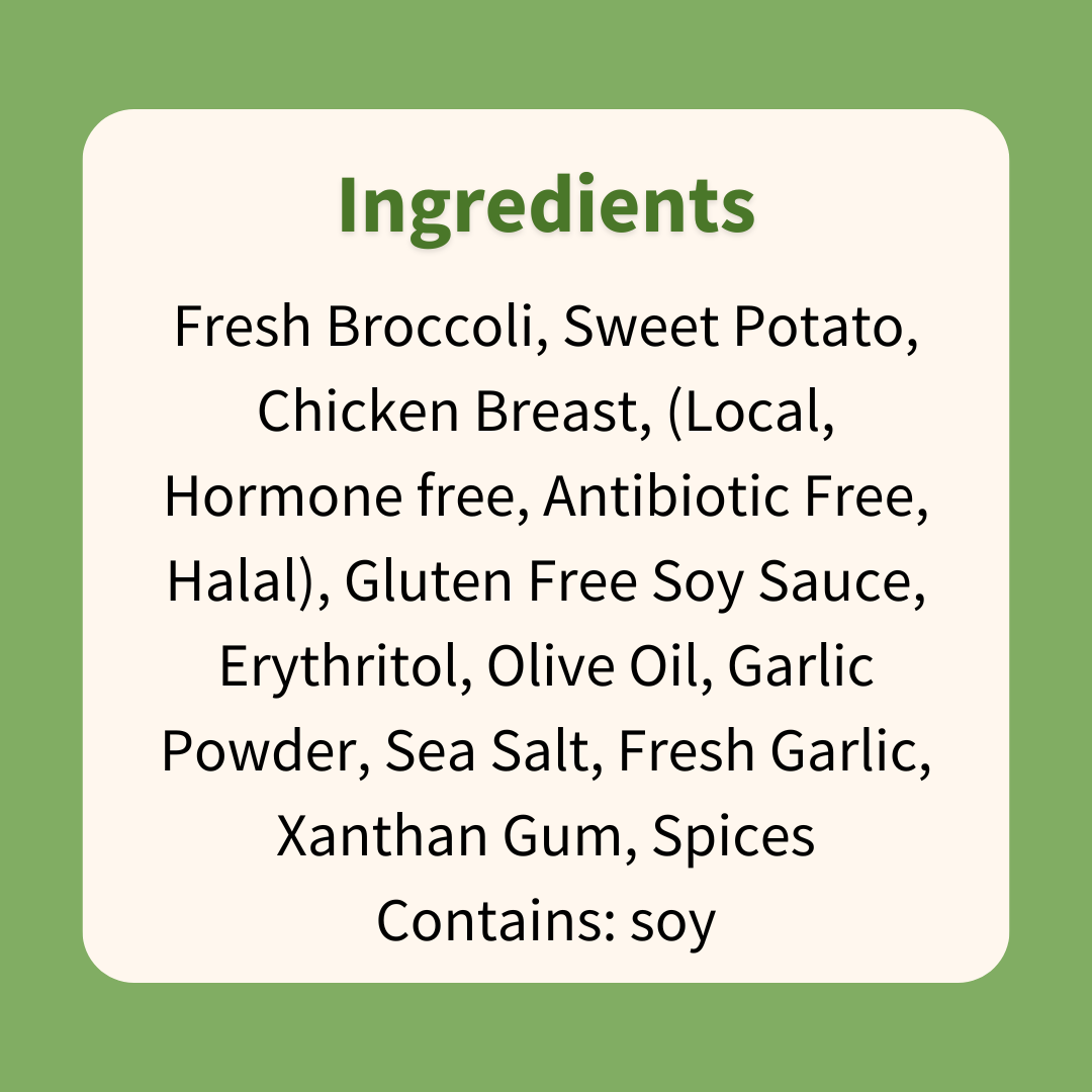 Fresh Broccoli, Sweet Potato, Chicken Breast, (Local, Hormone free, Antibiotic Free, Halal), Gluten Free Soy Sauce, Erythritol, Olive Oil, Garlic Powder, Sea Salt, Fresh Garlic, Xanthan Gum, Spices Contains: soy