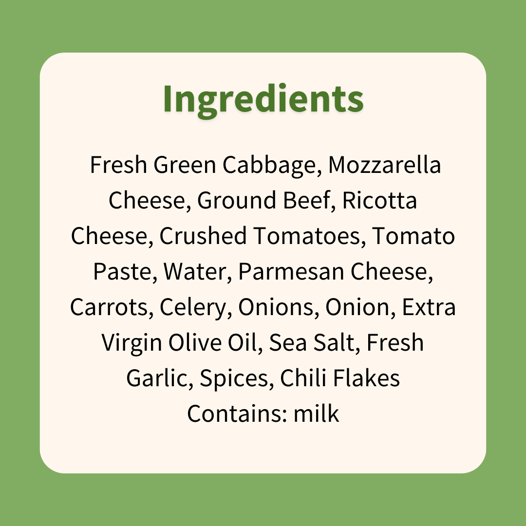 Fresh Green Cabbage, Mozzarella Cheese, Ground Beef, Ricotta Cheese, Crushed Tomatoes, Tomato Paste, Water, Parmesan Cheese, Carrots, Celery, Onions, Onion, Extra Virgin Olive Oil, Sea Salt, Fresh Garlic, Spices, Chili Flakes