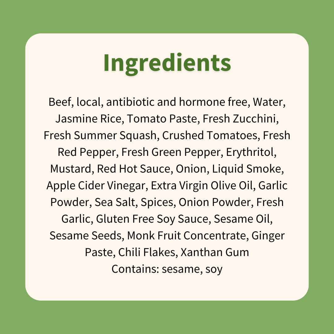 Beef, local, antibiotic and hormone free, Water, Jasmine Rice, Tomato Paste, Fresh Zucchini, Fresh Summer Squash, Crushed Tomatoes, Fresh Red Pepper, Fresh Green Pepper, Erythritol, Mustard, Red Hot Sauce, Onion, Liquid Smoke, Apple Cider Vinegar, Extra Virgin Olive Oil, Garlic Powder, Sea Salt, Spices, Onion Powder, Fresh Garlic, Gluten Free Soy Sauce, Sesame Oil, Sesame Seeds, Monk Fruit Concentrate, Ginger Paste, Chili Flakes, Xanthan Gum Contains: sesame, soy