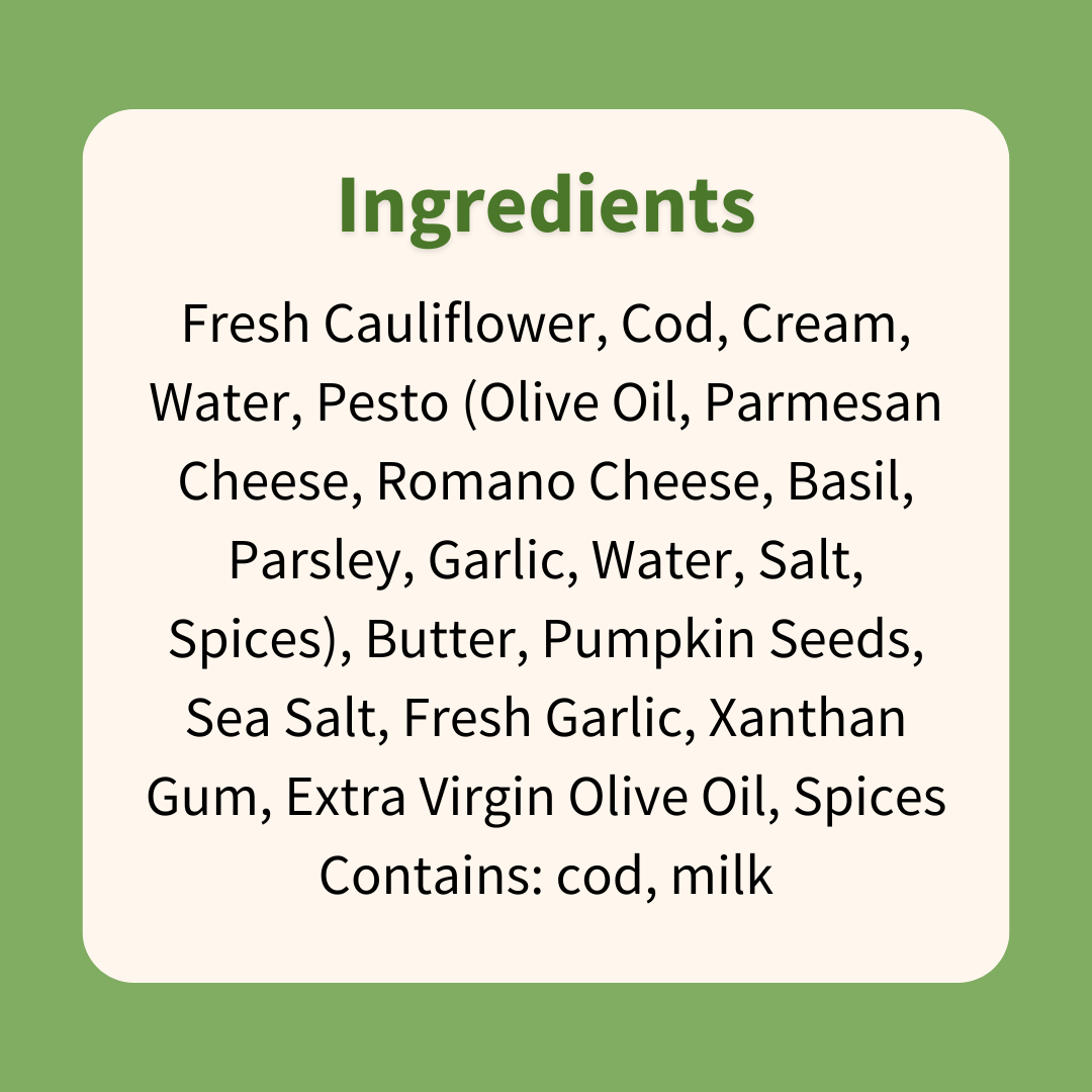 Fresh Cauliflower, Cod, Cream, Water, Pesto (Olive Oil, Parmesan Cheese, Romano Cheese, Basil, Parsley, Garlic, Water, Salt, Spices), Butter, Pumpkin Seeds, Sea Salt, Fresh Garlic, Xanthan Gum, Extra Virgin Olive Oil, Spices Contains: cod, milk