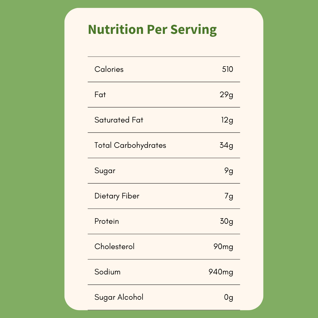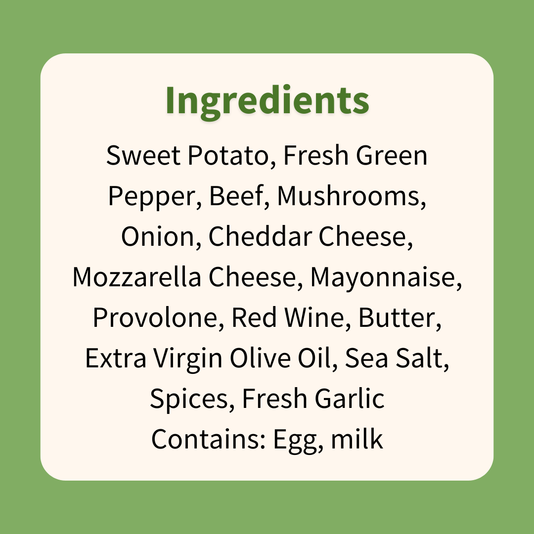 Sweet Potato, Fresh Green Pepper, Beef, Halal, Mushrooms, Onion, Cheddar Cheese, Mozzarella Cheese, Mayonnaise, Provolone, Red Wine, Butter, Extra Virgin Olive Oil, Sea Salt, Spices, Fresh Garlic Contains: Egg, milk