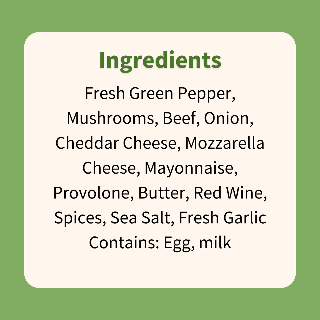Fresh Green Pepper, Mushrooms, Halal Inside Round Beef, Fresh Onion, Cheddar Cheese, Mozzarella Cheese, Mayonnaise, Provolone, Butter, Red Wine, Sea Salt, Fresh Garlic, Oregano, Black Pepper, Basil CONTAINS: Egg, milk