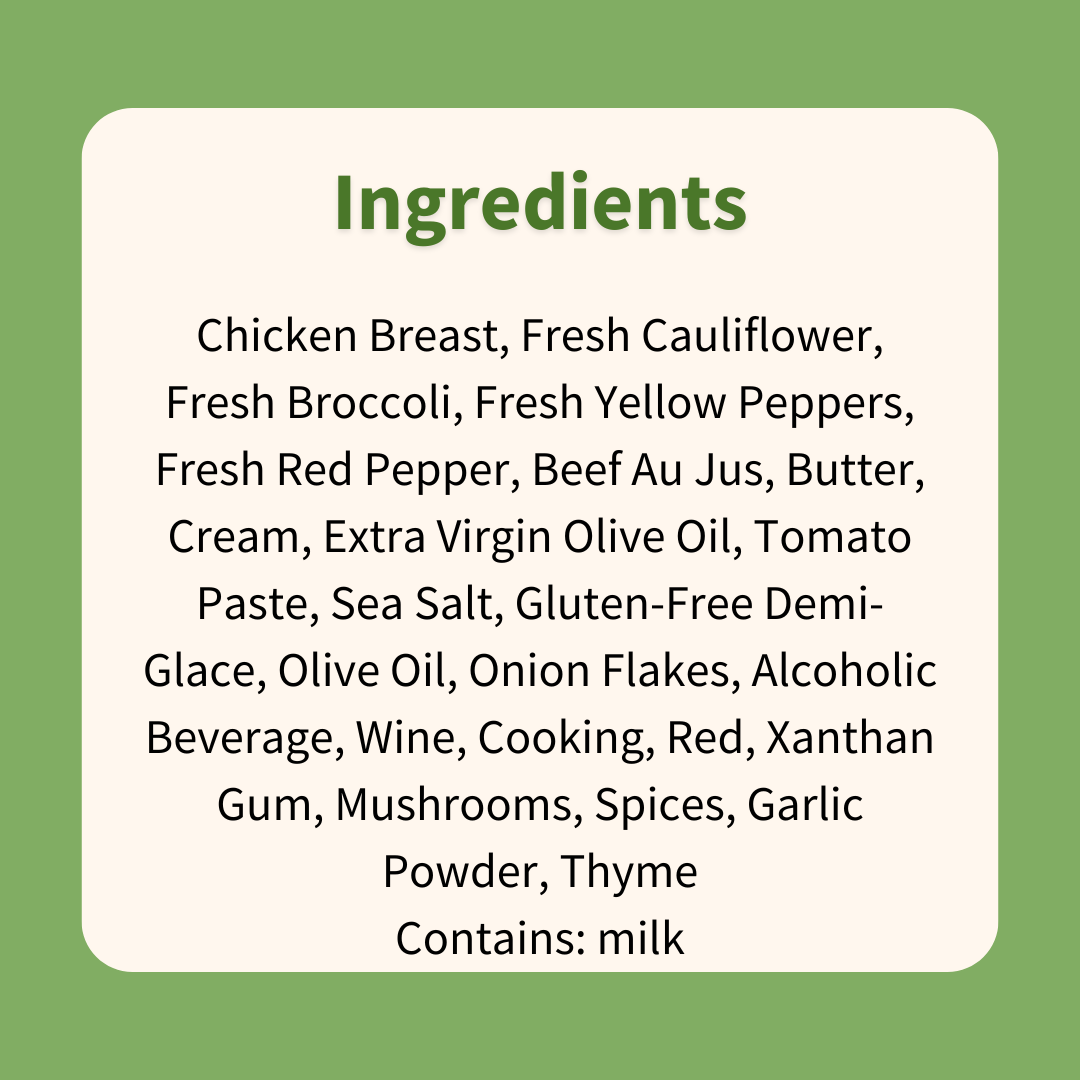 Chicken Breast, Fresh Cauliflower, Fresh Broccoli, Fresh Yellow Peppers, Fresh Red Pepper, Beef Au Jus, Butter, Cream, Extra Virgin Olive Oil, Tomato Paste, Sea Salt, Gluten-Free Demi-Glace, Olive Oil, Onion Flakes, Alcoholic Beverage, Wine, Cooking, Red, Xanthan Gum, Mushrooms, Spices, Garlic Powder, Thyme