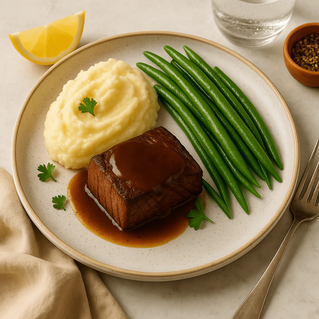 Tender, slow-roasted beef takes centre stage in this hearty, comforting dish. Served with a rich au jus, creamy mashed potatoes, and perfectly cooked green beans, it’s finished with a savoury gravy for the ultimate satisfying meal. With 41 grams of protein, this dish delivers bold flavour and nourishment in every bite—perfect for when you want a classic, feel-good dinner made with real, wholesome ingredients!
