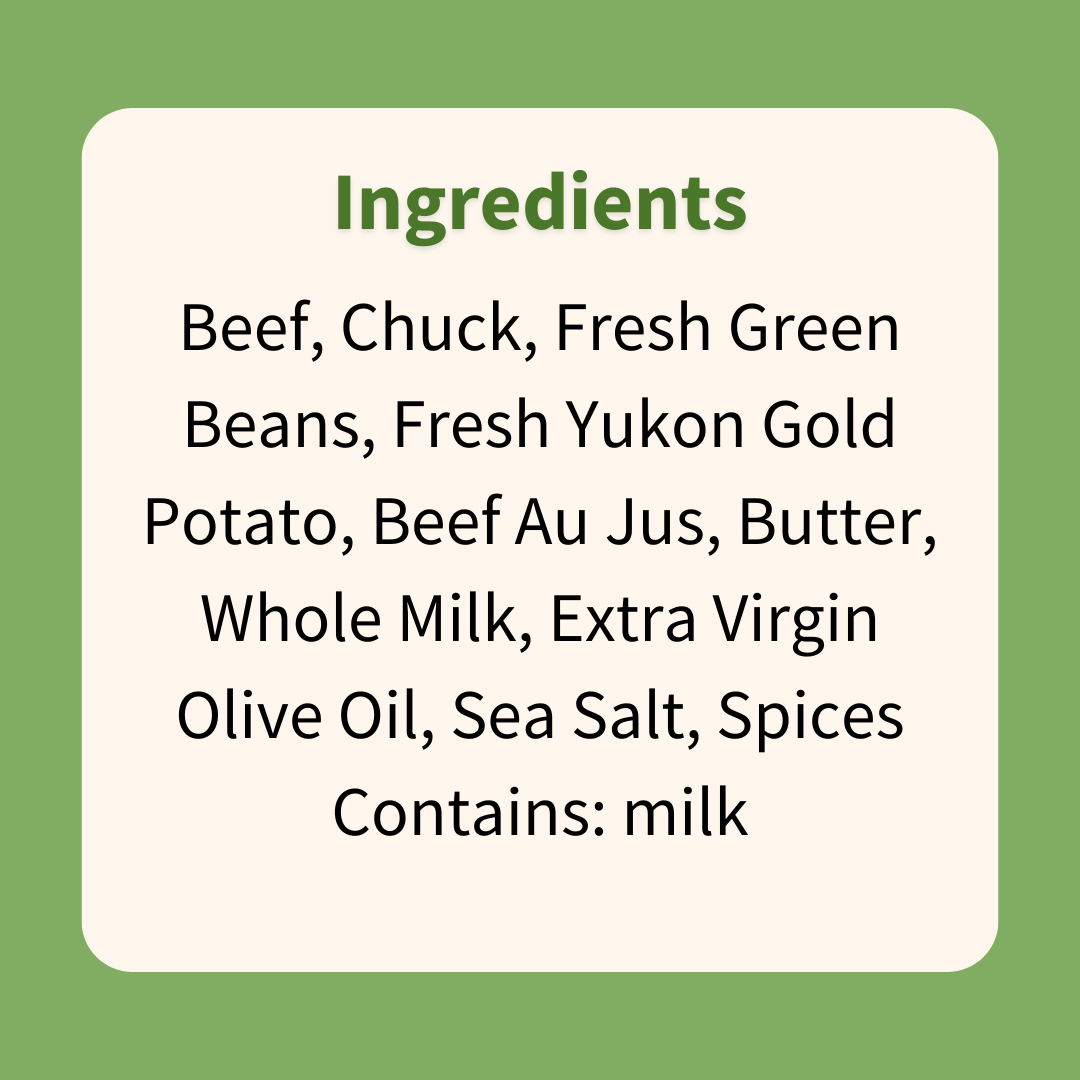 Beef, Chuck, Fresh Green Beans, Fresh Yukon Gold Potato, Beef Au Jus, Butter, Whole Milk, Extra Virgin Olive Oil, Sea Salt, Spices Contains: milk