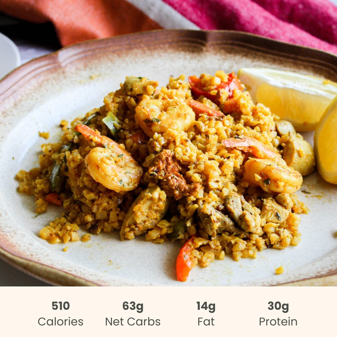 Experience the vibrant flavours of our Spanish Paella on Basmati Rice, perfect for a balanced, healthy lifestyle. Savour tender chicken thighs, succulent shrimp, and spicy chorizo combined with fresh green and red peppers, onions, and aromatic spices like turmeric, cumin, and garlic. Paired with fragrant basmati rice, this dish offers the perfect balance of healthy carbs and good protein. Made entirely from scratch with wholesome ingredients, every bite leaves you feeling satisfied, energized, and nourished. Enjoy a taste of Spain that proves healthy eating can be both delicious and fulfilling!