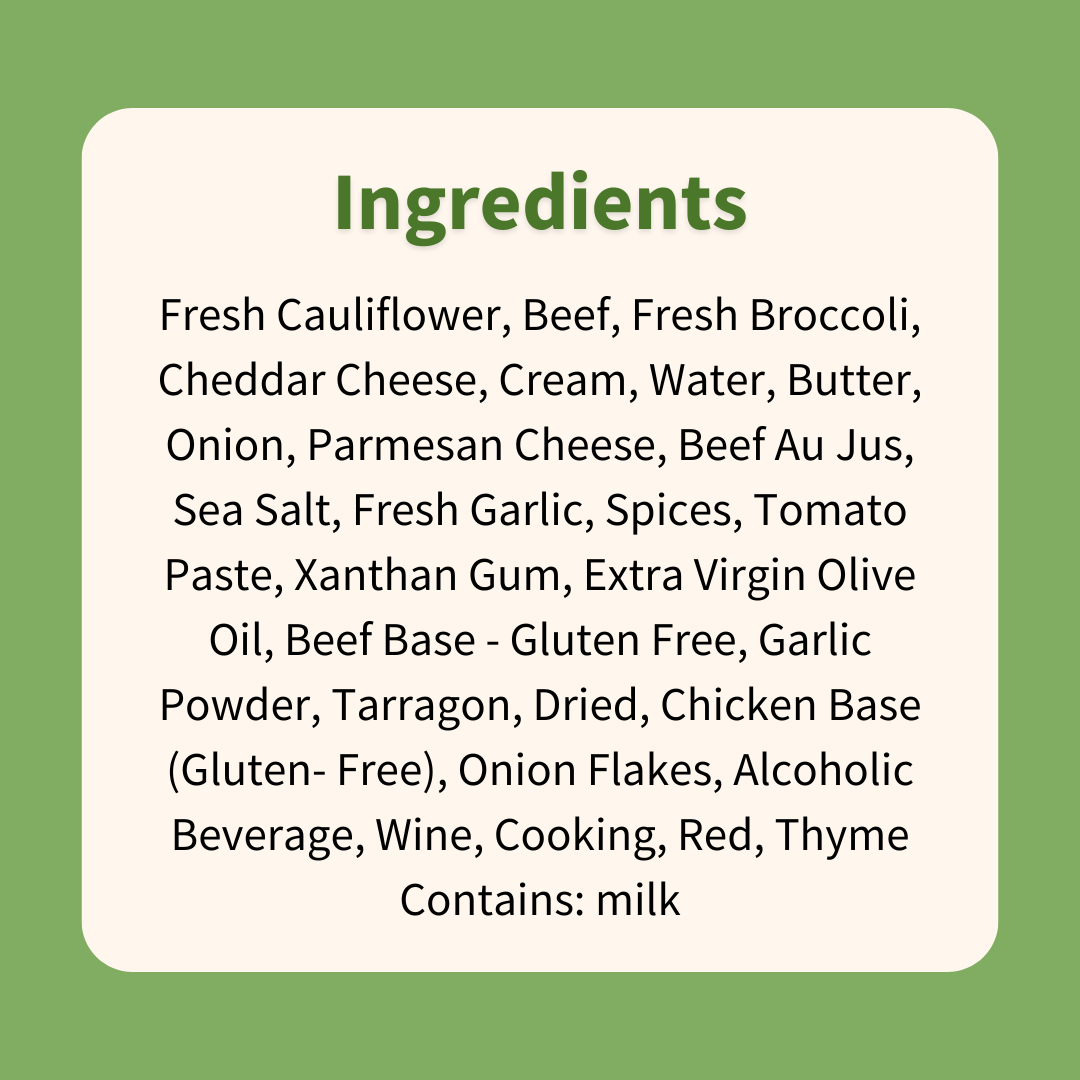 Fresh Cauliflower, Beef, Fresh Broccoli, Cheddar Cheese, Cream, Water, Butter, Onion, Parmesan Cheese, Beef Au Jus, Sea Salt, Fresh Garlic, Spices, Tomato Paste, Xanthan Gum, Extra Virgin Olive Oil, Beef Base - Gluten Free, Garlic Powder, Tarragon, Dried, Chicken Base (Gluten- Free), Onion Flakes, Alcoholic Beverage, Wine, Cooking, Red, Thyme Contains: milk