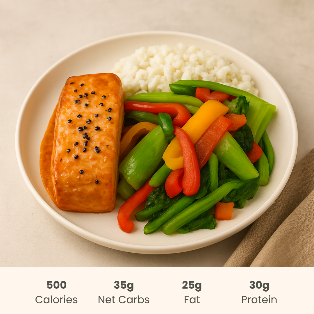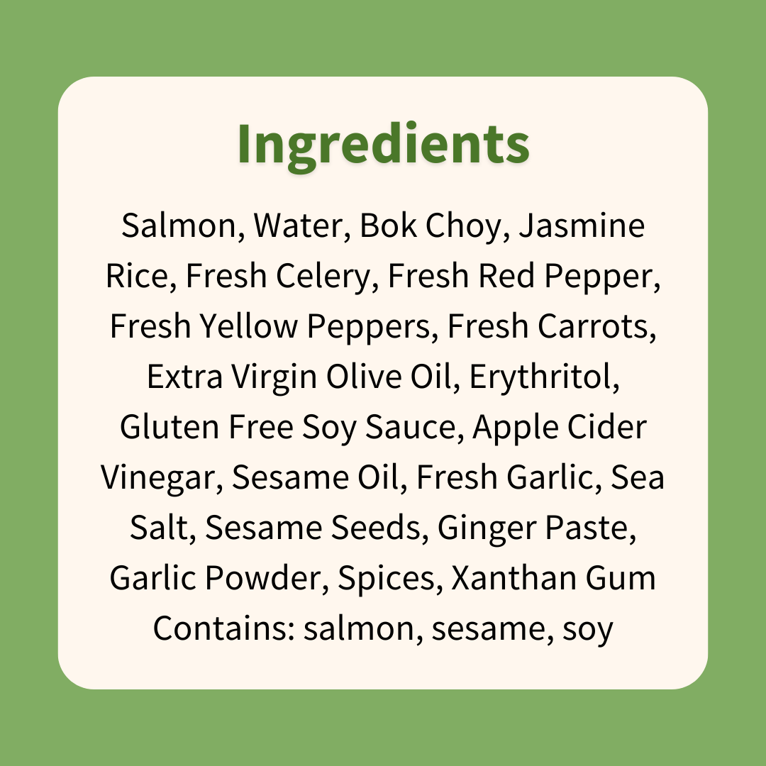 Salmon, Water, Bok Choy, Jasmine Rice, Fresh Celery, Fresh Red Pepper, Fresh Yellow Peppers, Fresh Carrots, Extra Virgin Olive Oil, Erythritol, Gluten Free Soy Sauce, Apple Cider Vinegar, Sesame Oil, Fresh Garlic, Sea Salt, Sesame Seeds, Ginger Paste, Garlic Powder, Spices, Xanthan Gum Contains: salmon, sesame, soy